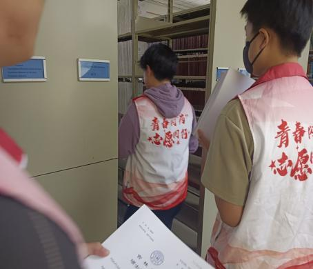 志愿者在图书馆两位老师的带领下,分为两组有序进行图书馆清洁活动。第一组志愿者在图书馆三楼进行论文书架换置工作,在老师的指导下,志愿者们以接力传递的方式,严格按照论文原有放置顺序,将它们搬运到新的书架上整理。
