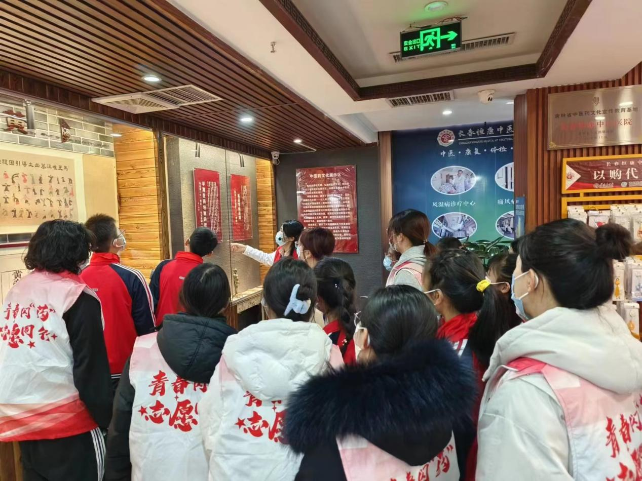 3月5日中午,志愿者们准时到达普庆社区和小学生志愿者们集合,大家进行两两组队后,一名大学生志愿者带领一名小学生,排队步行前往辖区志愿者联盟基地——长春恒康中医医院博物馆,进行参观交流学习。