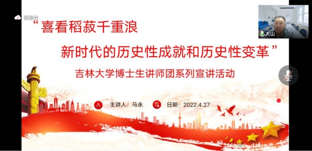 组织全体研究生观看了“喜看稻菽千层浪——新时代的历史性成就和历史性变革”的吉大博士生讲师团线上宣讲系列活动讲座第七讲,由新葡京