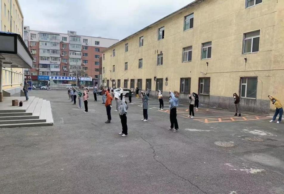 后院一排排小树上也开出了淡粉色的桃花,阵阵春风拂过,花瓣洋洋洒洒地落在同学们灿烂的笑容里,同学们在舒展筋骨的同时也舒缓了心情。活动结束后,学生们进行扫码消毒,有秩序地回到寝室。