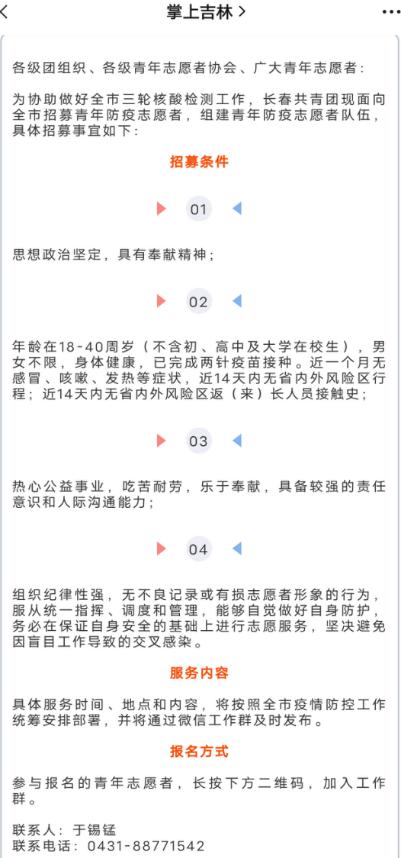 2022年3月,疫情突如其来席卷长春市,整个城市被按下了暂停键。由于没有及时回到学校宿舍,我被迫在家成为了“留守儿童”。每天的信息被疫情刷屏,疫情肆虐的前几天,掌上吉林在公众号上发布了一条“吉林省志愿者招募通”,我立刻有了兴趣便积极报名参加。