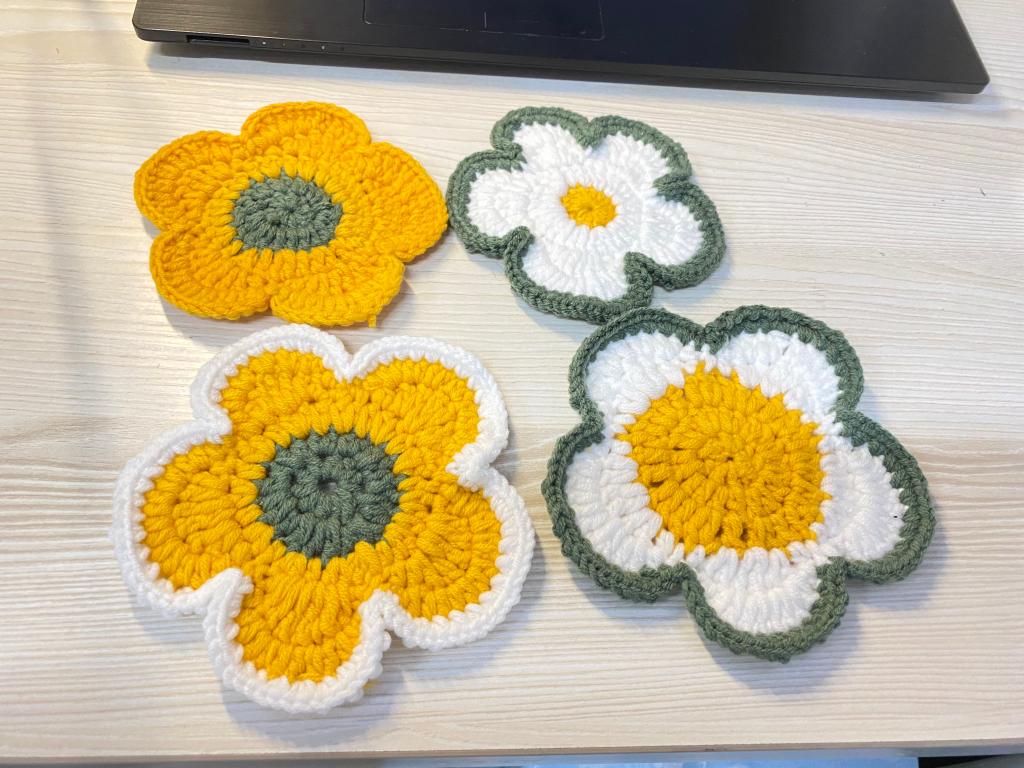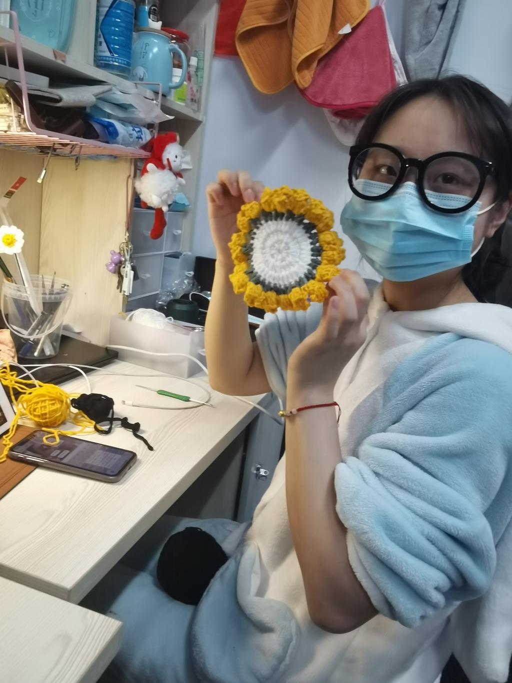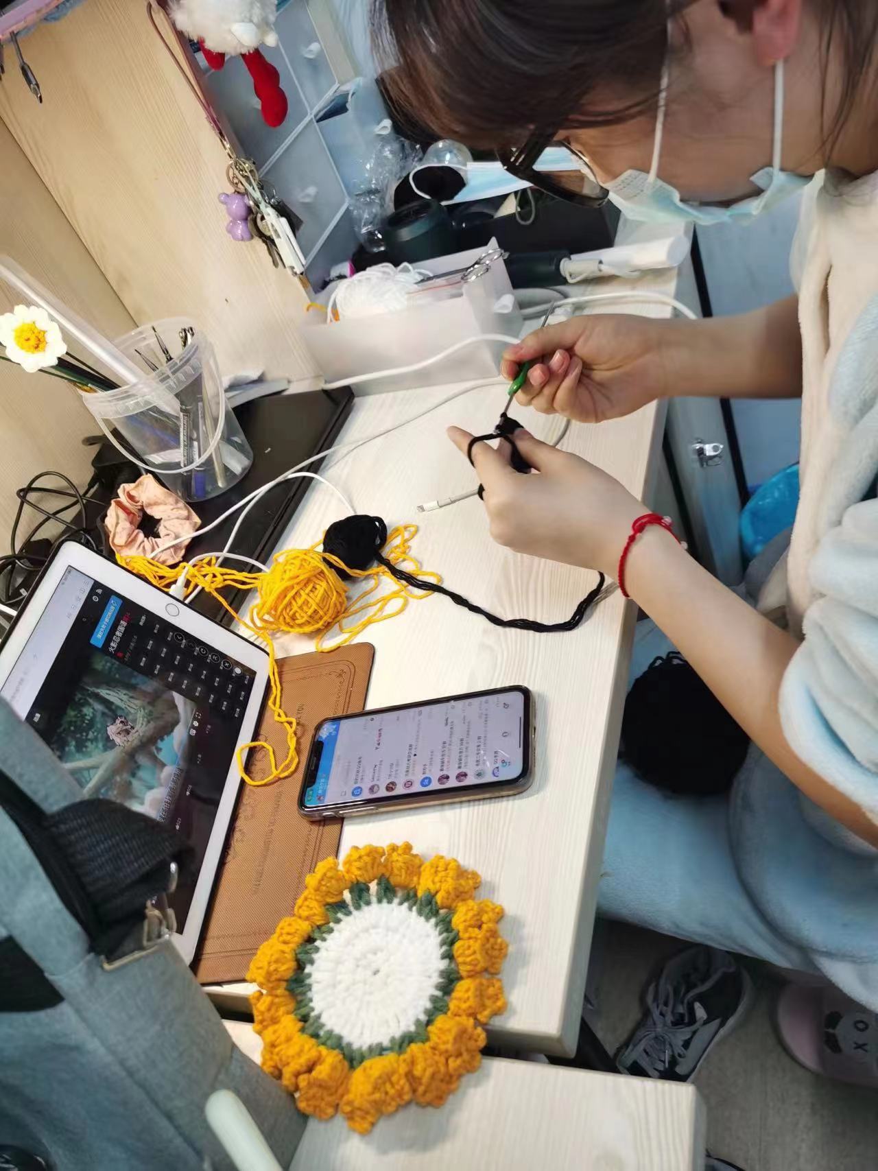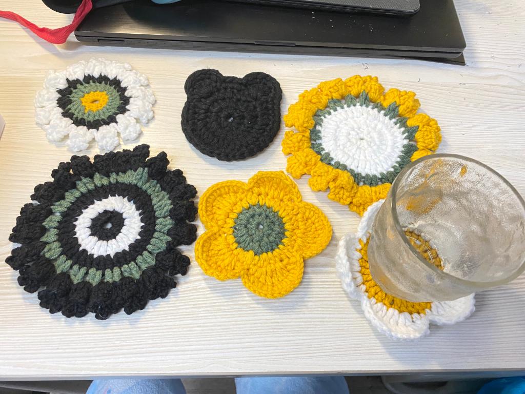 室友的毛线,阔别已久的钩针,带给我新的想法。我好像找到了新动力,便给自己立了个小目标,我想为我的朋友们准备一个纯手工的小礼物,等疫情结束的时候送给他们。我打算做几个钩花杯垫,虽然不是很贵重的小玩意,但我希望用它的人会记的我们之间的友谊。跟随着视频从最基础的短针学起,一直到超长针;从最简单的圆形出发,再到花瓣、小熊的形状。我越来越熟练,现在已经达到看一眼图片里的样式便知道如何动手做出来,这也算是我在疫情期间的小小收获,这就是所谓“成长“的实际感受了吧。我还把我钩花的过程记录了下来,发到学校和学院的各个分享平台和大家一起分享做手工的快乐。