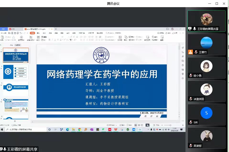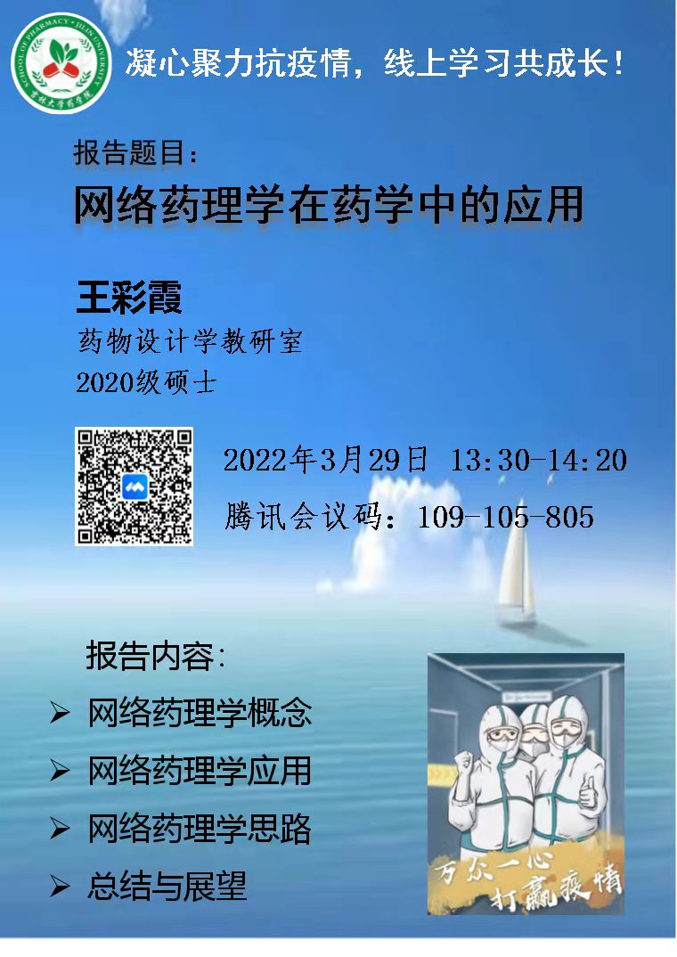 自3月12日疫情爆发以来,长春市全面停工停产停学,也对大家的学习生活造成了很大影响。为了助力抗击疫情,停课不停学,我院药物设计学教研室李平亚教授和刘金平教授于3月29日下午13:30组织开展了一场《网络药理学在药学中的应用》线上培训,网络药理学作为一门新的交叉学科,将网络科学、生物信息学、计算机科学和数学等学科的方法结合到中药药理的研究中,从分子水平和分子网络调控的背景中阐明中药的作用机理。而且网络药理学对于现在疫情中的同学们来说,最大的优势就是不需要进入实验室做实验,所以非常实用。