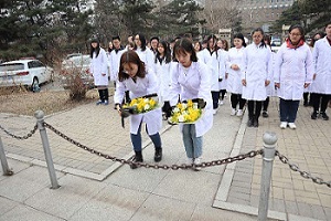 我院参加祭扫的同学们准备了两捧黄菊,朴素坚韧的植物最能表示哀挽。