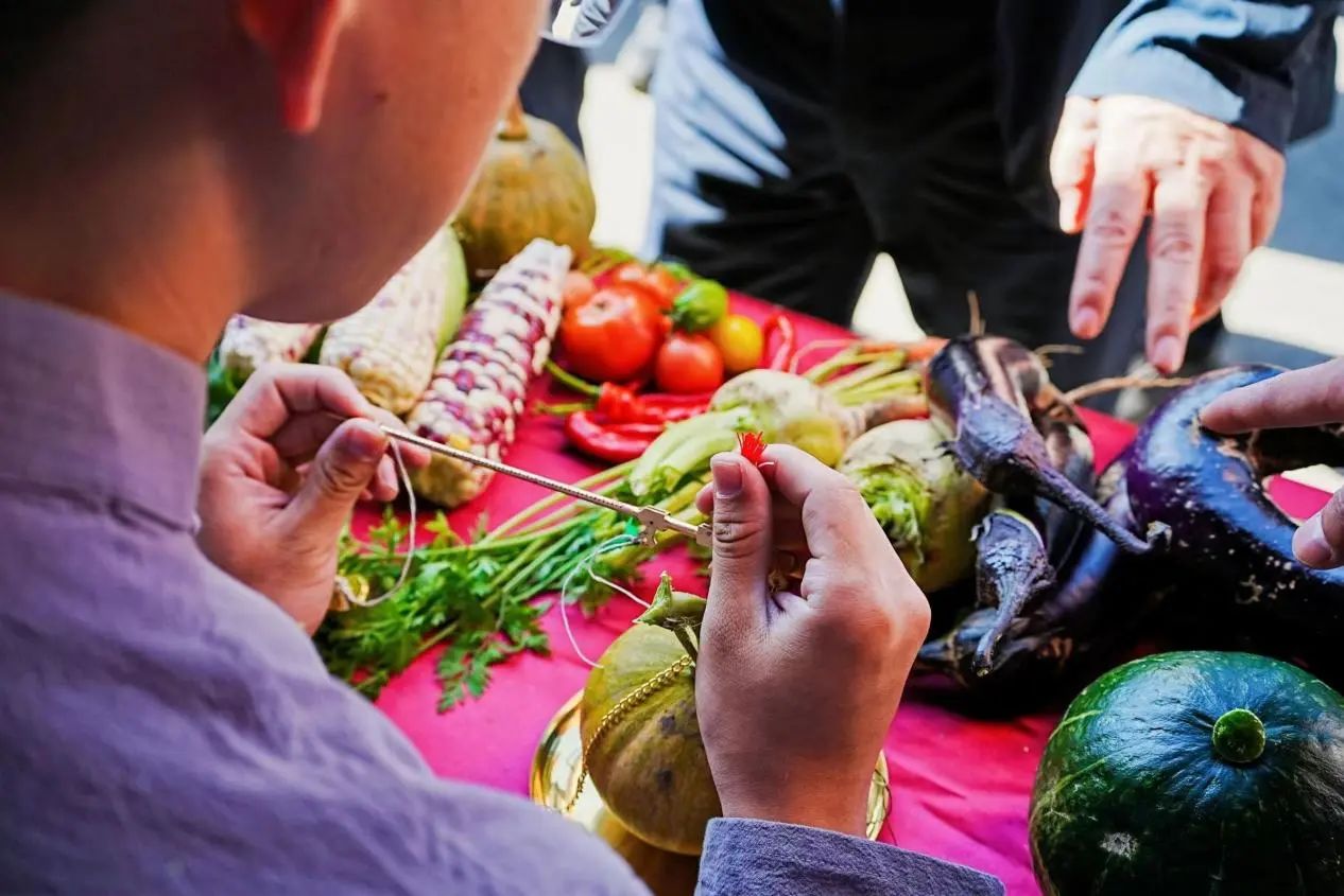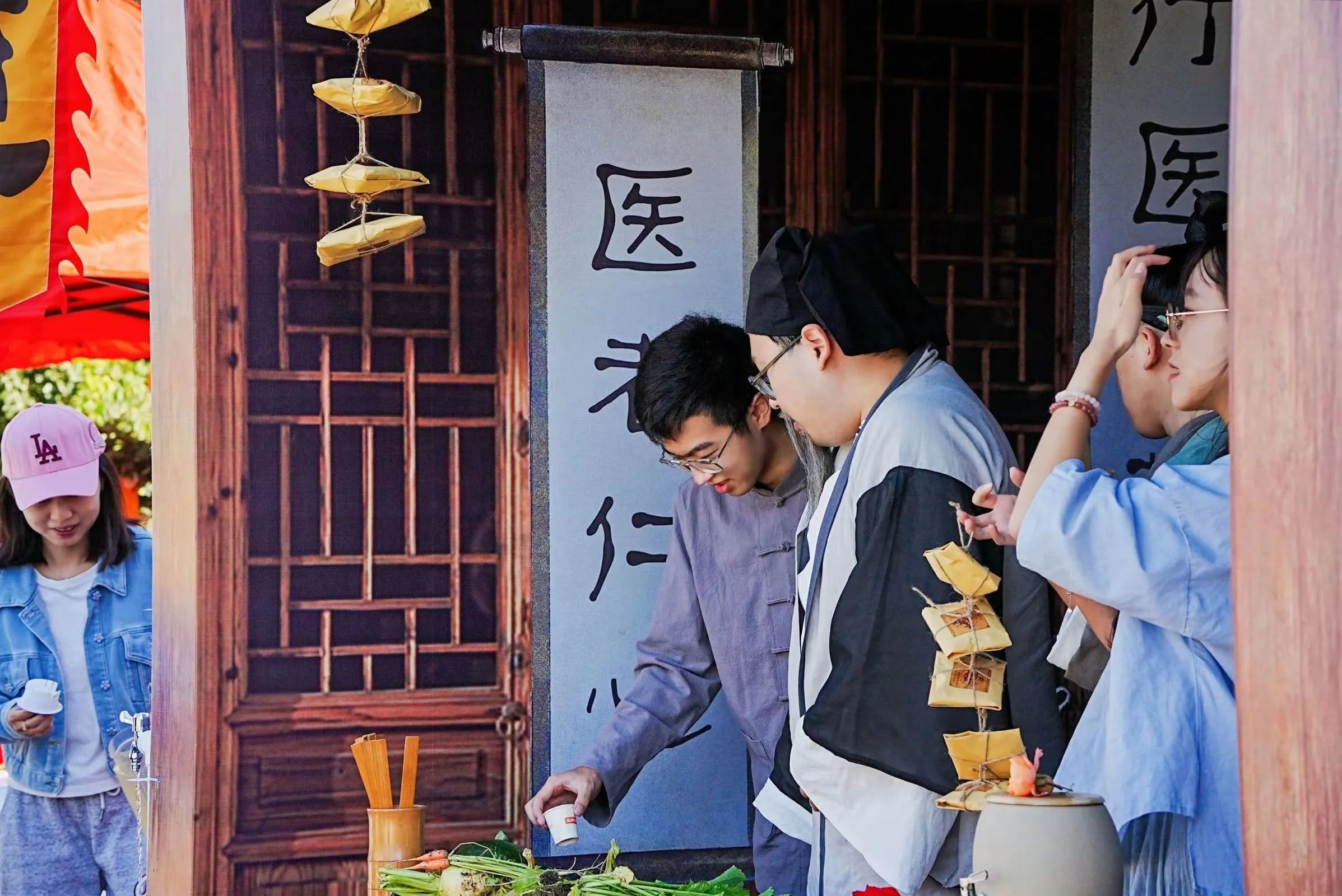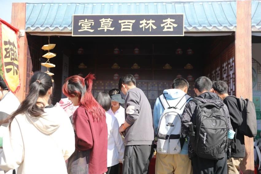现场共设置两种游戏,在“掂斤估两易本草”游戏中,参与活动的同学在药童决明处抽取作物标牌,前往采摘园中找寻对应作物,采摘完毕后返回药童决明处称重,若在误差范围内,即可兑换酸梅汤食疗药包中的一味药材。参与活动的同学既可亲自体验采摘收获的乐趣,又能认识基地农林作物,并获得相关生药知识的讲解,进一步认识到农业的重要性,药学专业的实用性。在“擘两分星准药量”游戏中,我院在学科基础上融入了中国传统元素,参加活动的同学在药童少辛处抽取写有题号的题签,学徒为同学念出有关中药材知识的题目及选项,同学根据选项将箭投进相对应答案的“壹”壶或“贰”壶中,最后由药房先生给出答案并开展文言文式科普讲解。同学们在游戏中体会古时士大夫投壶游戏之乐,同时也学习了中草药的相关知识。游戏之外,同学们还可在“杏林百草堂”获得纪念印章,为自己的“成绩单”填上一抹靓丽的颜色与标记。