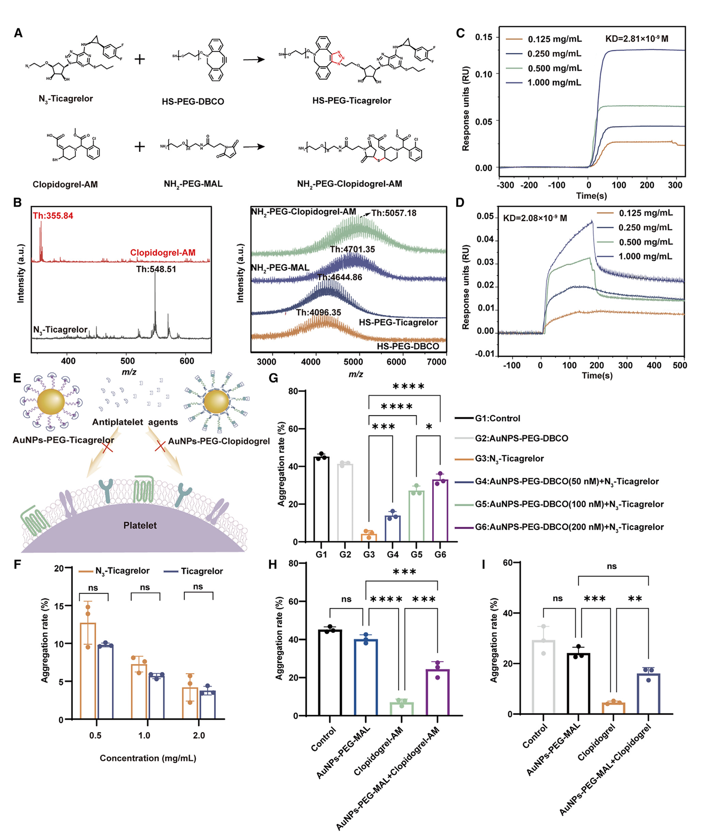 (a) HS-PEG-DBCO和NH2-PEG-MAL分别与N3替格瑞洛和氯吡格雷的活性代谢产物发生化学反应;(b)N3替格瑞洛、氯吡格雷AM、HS-PEG-DBCO和N3替格瑞洛的结合物、NH2-PEG-MAL和氯吡格雷AM的结合物的基质辅助激光解吸电离飞行时间质谱(MALDI-TOF-MS);(c)SPR法测定HS-PEG-DBCO与N3替格瑞洛的结合亲和力;(d)NH2-PEG-MAL和氯吡格雷AM的结合亲和力;(e)血小板聚集率试验示意图。(f)氯吡格雷和N3替格瑞洛在血小板聚集试验中的抗血小板活性(n=3)。(g)在血小板聚集试验中,AuNPs-PEG-DBCO对N3-Ticagrelor的体外功能逆转(n=3)。(h)在血小板聚集试验中,AuNPs-PEG-MAL对氯吡格雷AM的体外功能逆转(n=3)。(i)AuNPs-PEG-MAL在血小板聚集试验中逆转氯吡格雷的体外功能(n=3)。*P<0.05;**P<0.01;***P<0.001;****P<0.0001