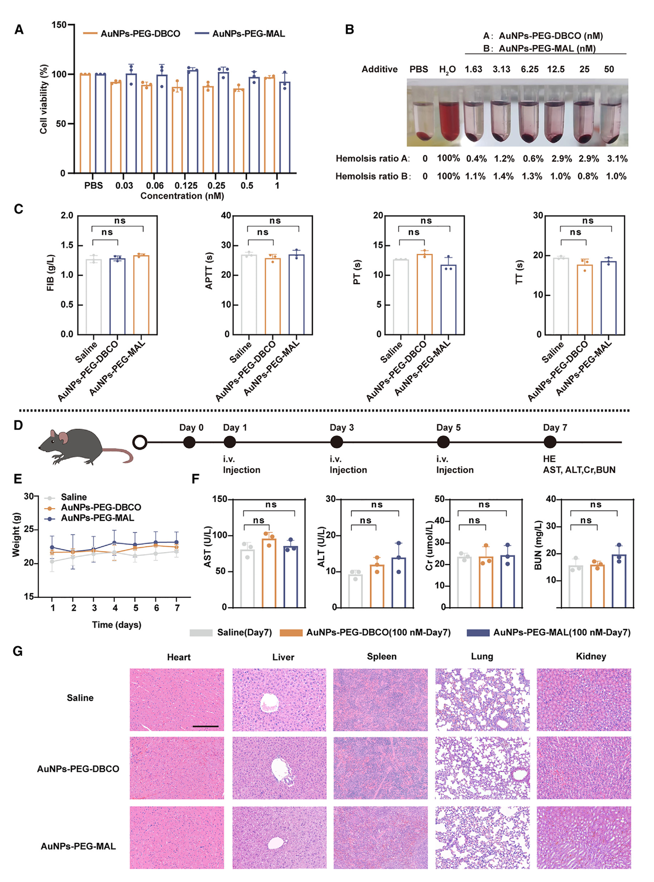 图6:AuNP-PEG-DBCO和AuNPs-PEG-MAL的生物安全性