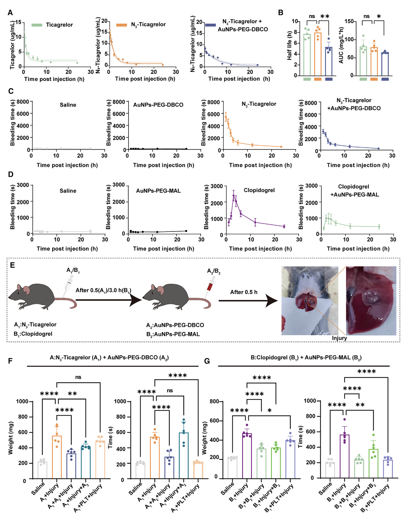 针对上述问题,国家纳米中心张银龙教授团队与我院刘继华教授课题组联合开发了以点击化学修饰的金纳米颗粒AuNPs-PEG-DBCO和AuNPs-PEG-MAL,能够分别减轻抗血小板药物N3-替格瑞洛和氯吡格雷引起的出血现象,促进血小板功能的恢复,从而逆转N3-替格瑞洛和氯吡格雷药物的抗血小板作用,提高药物使用的安全性。