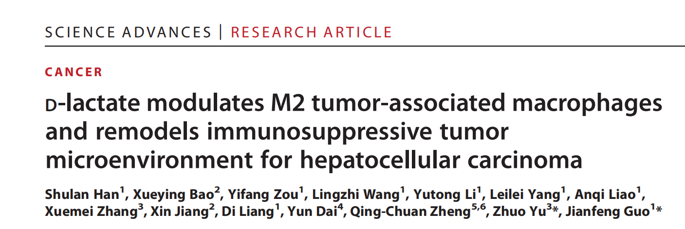郭建锋教授团队在Science Advances上发表题为D-lactate modulates M2 tumor-associated macrophages and remodels immunosuppressive tumor microenvironment for hepatocellular carcinoma的论文。该研究发现一种肠道微生物组的小分子代谢物D-lactate (DL)可通过抑制磷脂酰肌醇-3激酶(PI3K)/蛋白激酶B (Akt)通路和激活核因子-κB (NF-κB)通路将TAM从M2调控到M1。另外,该研究还开发了一种靶向肝癌肿瘤微环境M2巨噬细胞的HCC膜包被并连接M2pep的PLGA纳米颗粒(NP),用于将DL输送到HCC内的M2 TAM中。由此产生的纳米制剂(DL@NP-M-M2pep)通过HCC膜相关的归巢功能在肿瘤内积累,并通过M2pep介导的靶向能力将DL转运到M2 TAM,导致M2 TAM转化为M1,并在同种异体移植和致癌诱导的原位HCC小鼠模型中重塑免疫抑制的TME。此外,抗CD47抗体与DL@NP-M-M2pep联合治疗肝癌小鼠实现了癌变诱导的原位肝癌小鼠的长期存活,为肝癌的联合治疗提供了一条很有前景的途径。